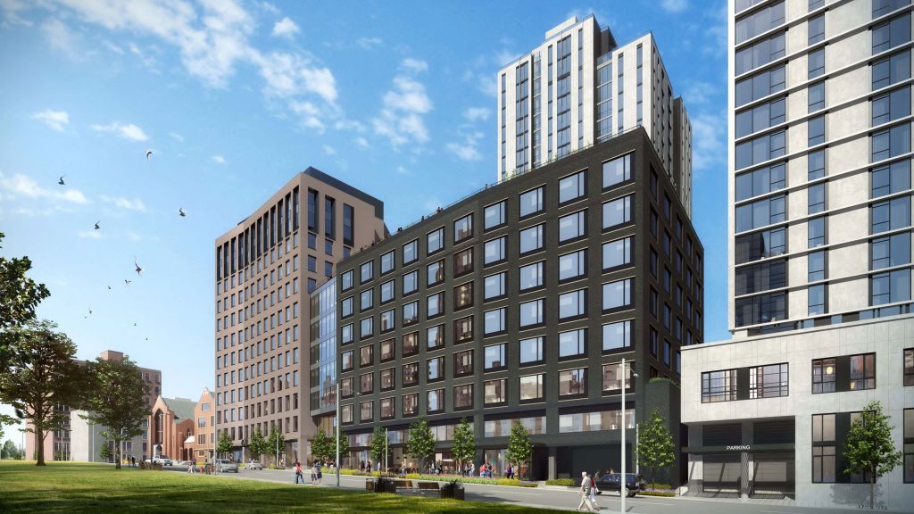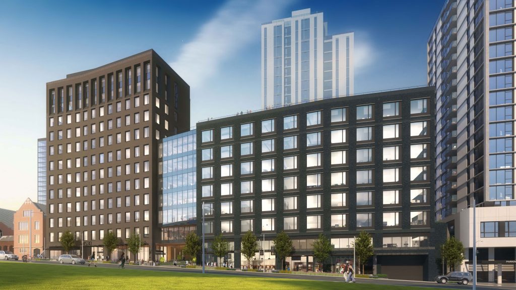 Building I offers 247,000 square feet of office space, featuring expansive open floor plates, abundant natural light, and panoramic views. Its exterior blends brick, operable punch windows, and curtain wall accents, while interior amenities include a full gym, locker rooms, bike storage, and service areas.