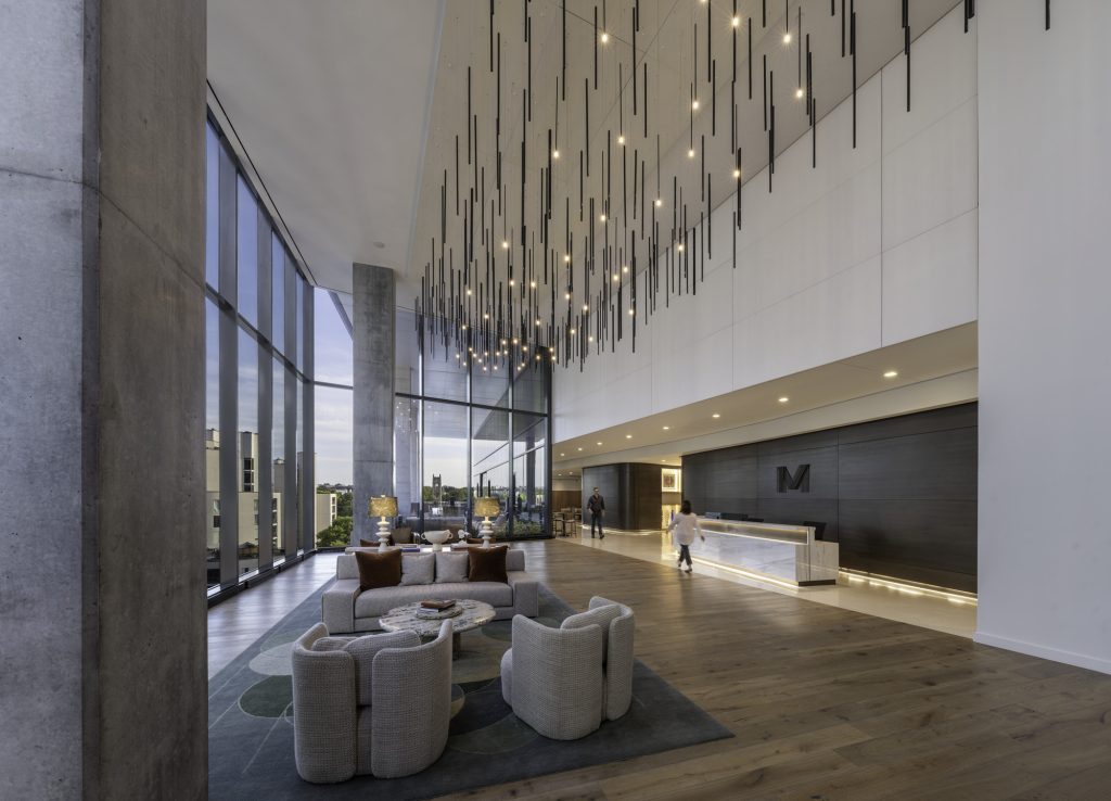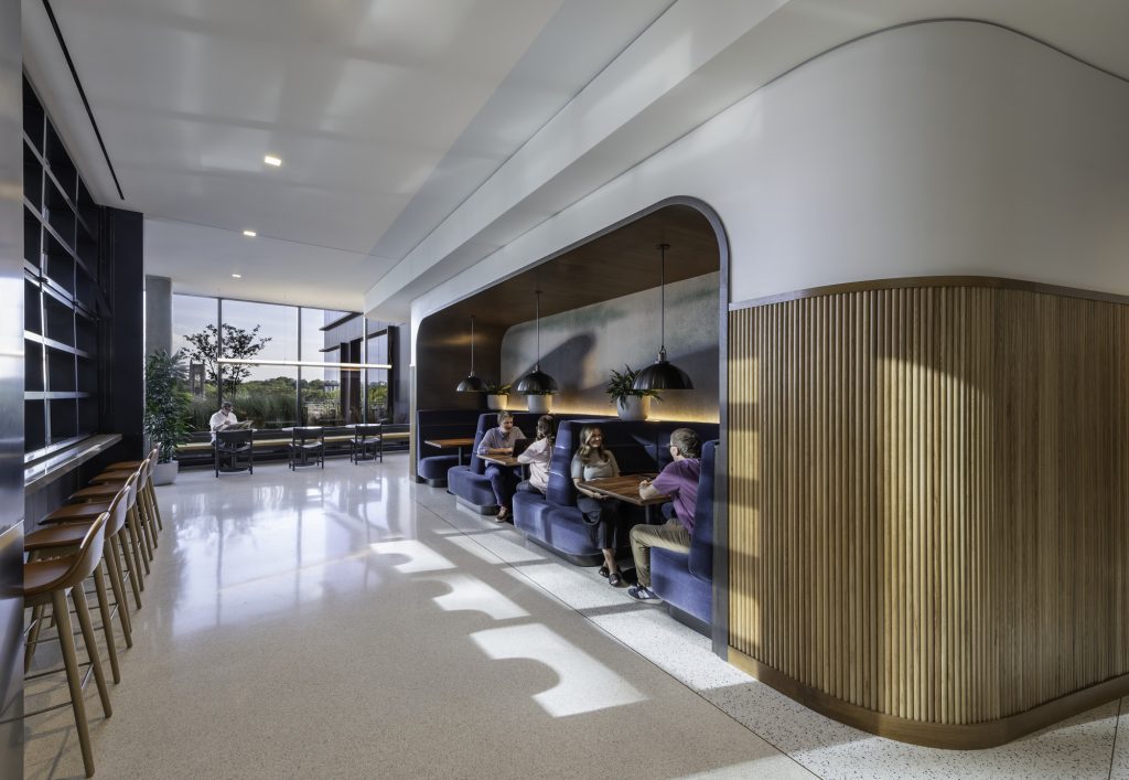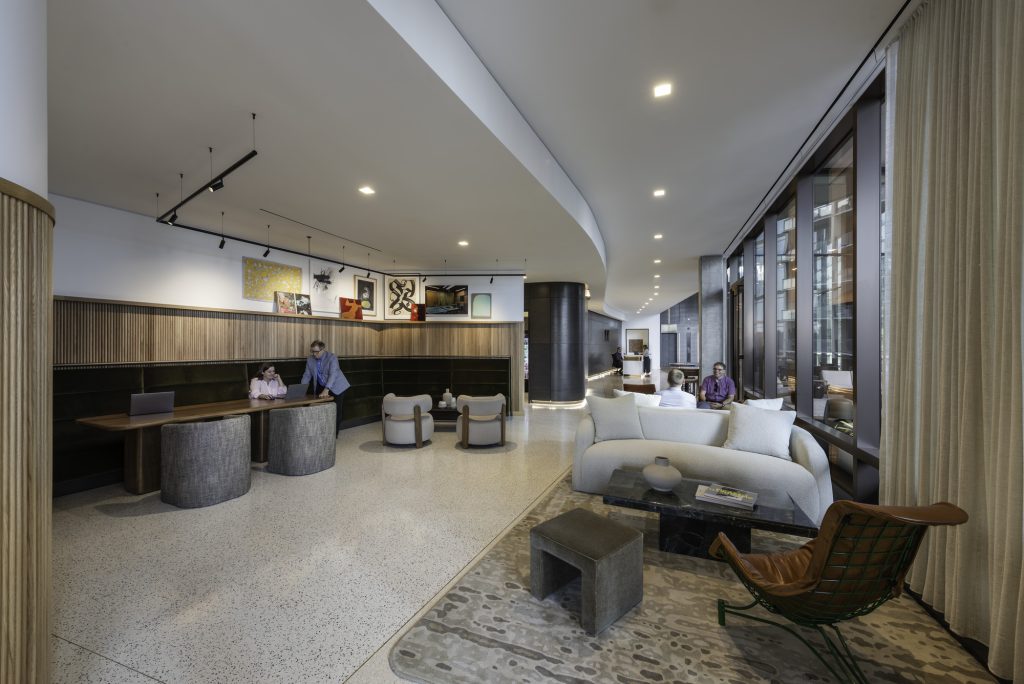 The story of The Moore Building begins with music history. Named for Scotty Moore, Elvis Presley’s legendary guitarist, the building rises on the site of his former recording studio, Music City Recorders, later known as Studio 19. Drawing inspiration from the 1970s and the studio’s iconic legacy, the interiors blend subtle musical nods with warm wood elements, creating a modern, refined workplace that honors its creative roots.