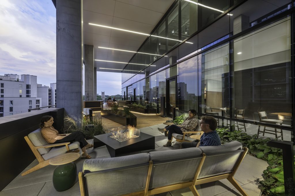 Inside, the building is designed for connection and lifestyle. An 8th-floor terrace with seating, fire pits, and green space offers a retreat from the office. Tenants also enjoy a luxury fitness center, bike storage, showers and lockers, a 35-person conference space, diverse food offerings, and a catering kitchen for daily use or events. For added convenience, a pull-through motor court and rideshare staging lanes streamline arrivals and departures.