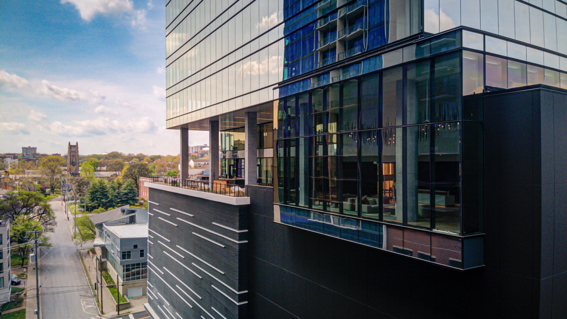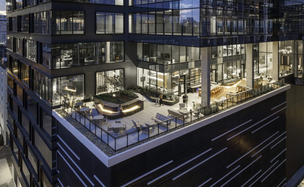 On the 8th floor, a sky lobby opens onto an 11,000-square-foot amenity deck, offering sweeping views of Midtown and Vanderbilt University. This outdoor space invites tenants to gather, relax, or work in the fresh air. The ground floor features activated retail and an extended lobby, including one of Nashville’s first porte-cochere entrances, combining convenience with style.